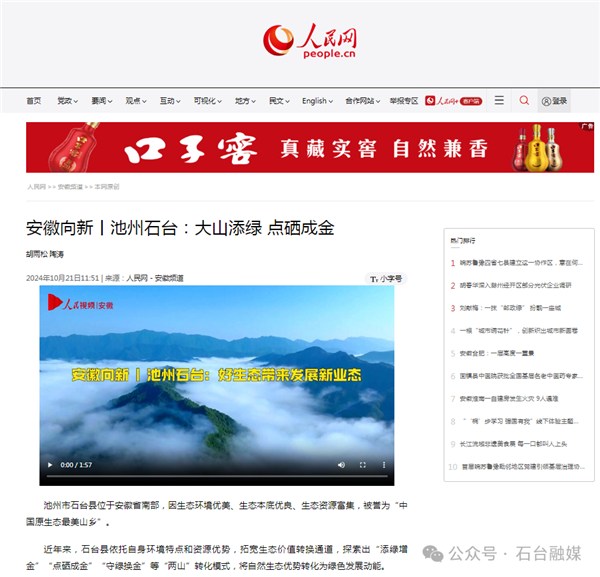 10月21日,《人民网》以“安徽向新丨池州石台:大山添绿 点硒成金”为题,聚焦石台生态!