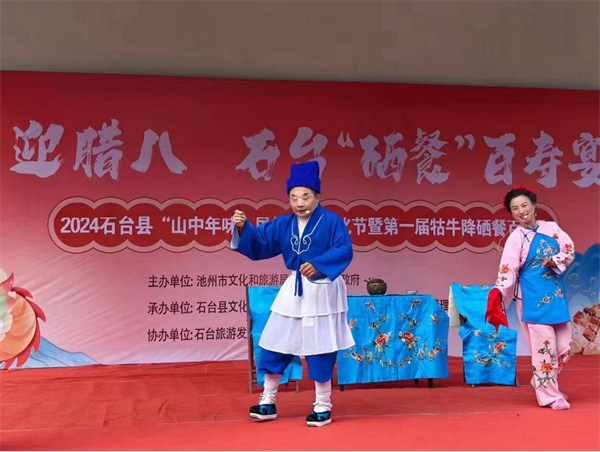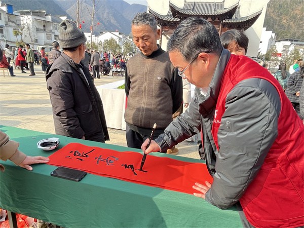 活动中,不仅有黄梅戏曲《闹花灯》、石台本土戏种目连戏曲目《元旦上寿》等老年人喜闻乐见的文艺演出,让人民群众充分感受、体验到非遗精髓;还邀请了数位书法爱好者现场书写对联、福字赠送给周边村民,一幅幅对联连接起新年的喜气与幸福;更有牯牛降聚龙酒店大厨现场烹饪石台特色美食一品锅。活动现场一片欢腾,老人们看着演出、品着美食、拉着家常,脸上洋溢着对幸福生活的笑容。“太热闹了,我今年92岁了,今年的腊八节不仅尝到了石台特色美食,还看到了这么多非遗节目,很开心啊,也希望大家身体健康”来自新火村的吴明机老人笑着说道。