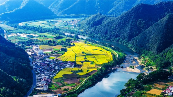 金秋时节,石台县境内秋浦河蜿蜒流淌的河水与连绵的山峦、金色的田园和民居相映成景。 通讯员 何清 汪建国 摄