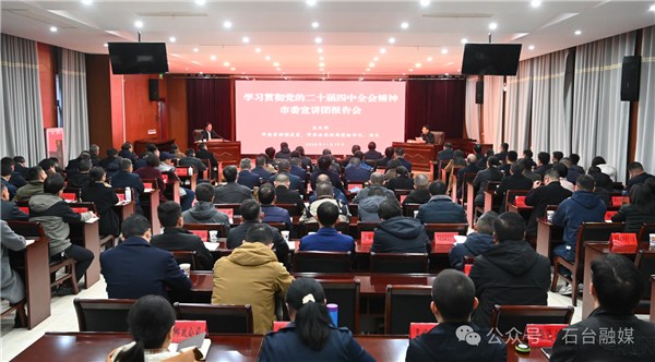 按照市委统一部署,11月19日下午,学习贯彻党的二十届四中全会精神市委宣讲团报告会在石台举行。市委宣讲团成员、市农业农村局党组书记、局长朱文明作宣讲报告。县委书记、县长张勇主持。县人大常委会主任鲍华,县政协主席曹文华,县委常委,其他在职县级领导干部和部分县级退休老同志等出席会议。