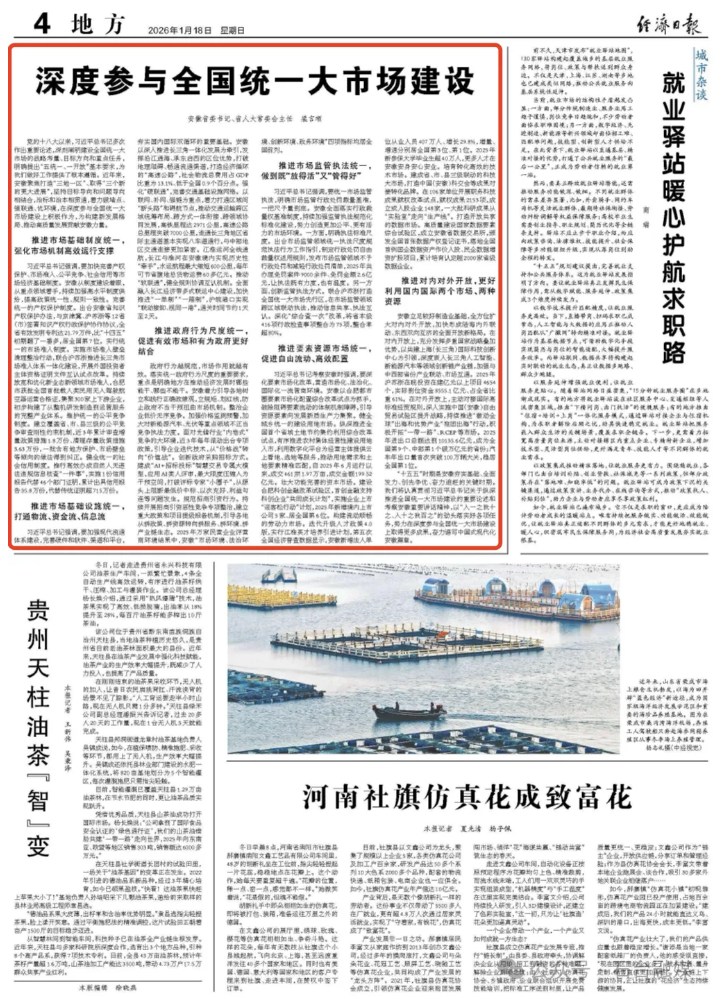 “十五五”时期是安徽夯实基础、全面发力、创先争优、奋力追赶的关键时期。我们将认真贯彻习近平总书记关于纵深推进全国统一大市场建设的重要论述和考察安徽重要讲话精神,以“人一之我十之、人十之我百之”的劲头落实好各项任务,努力在深度参与全国统一大市场建设上取得更多成果,奋力谱写中国式现代化安徽篇章。