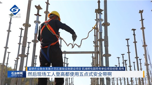 “我们在抢进度,也确保安全生产。在这个本工地创新使用的内架式盘扣,它主要是工具式安装,能确保结构更稳定、更安全,然后现场工人登高都使用五点式安全带,每个作业面都有安全防护。”周伟表示。