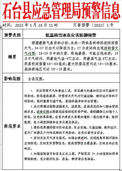 石台县应急管理局灾害预警〔2022〕1号