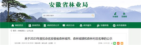按规定,对以上拟命名“安徽省森林城市”、“安徽省森林城镇”、“安徽省森林村庄”进行公示,公示期为5个工作日(2024年3月5日—2024年3月11日)。