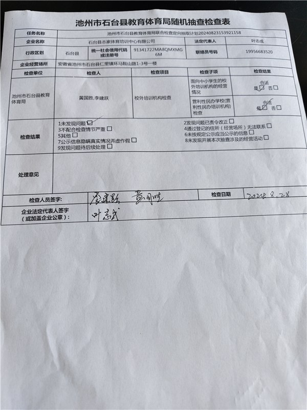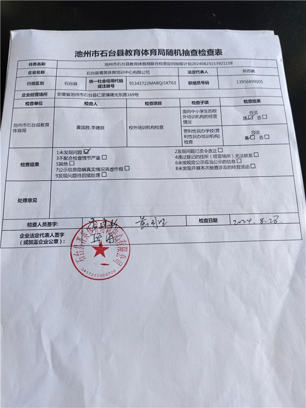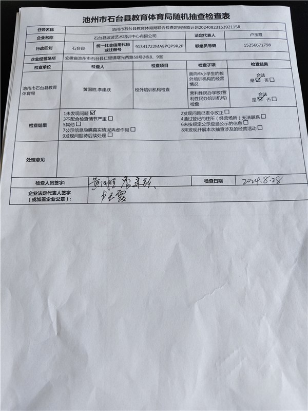 2024年8月28日,石台县教体局联合县文旅局、县市场监督管理局和县消防救援局开展2024年校外培训培训机构“双随机、一公开”联合抽查工作,共检查3家校外培训机构,均未发现问题。