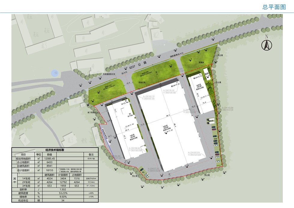 项目用地位于石台县横渡镇横渡村,用地面积12085.45平方米(约18.13亩)。新建1#车间建筑面积4024平方米,计容面积3404平方米,地下不计容面积620平方米;2#车间建筑面积4264平方米,计容面积12792平方米;3#车间建筑面积653平方米,计容面积1959平方米。总建筑面积8941平方米,计容面积18155平方米,容积率1.502,建筑密度53.23%,绿地率9.5%;机动车位34辆。