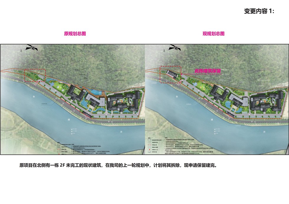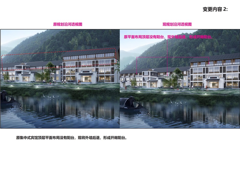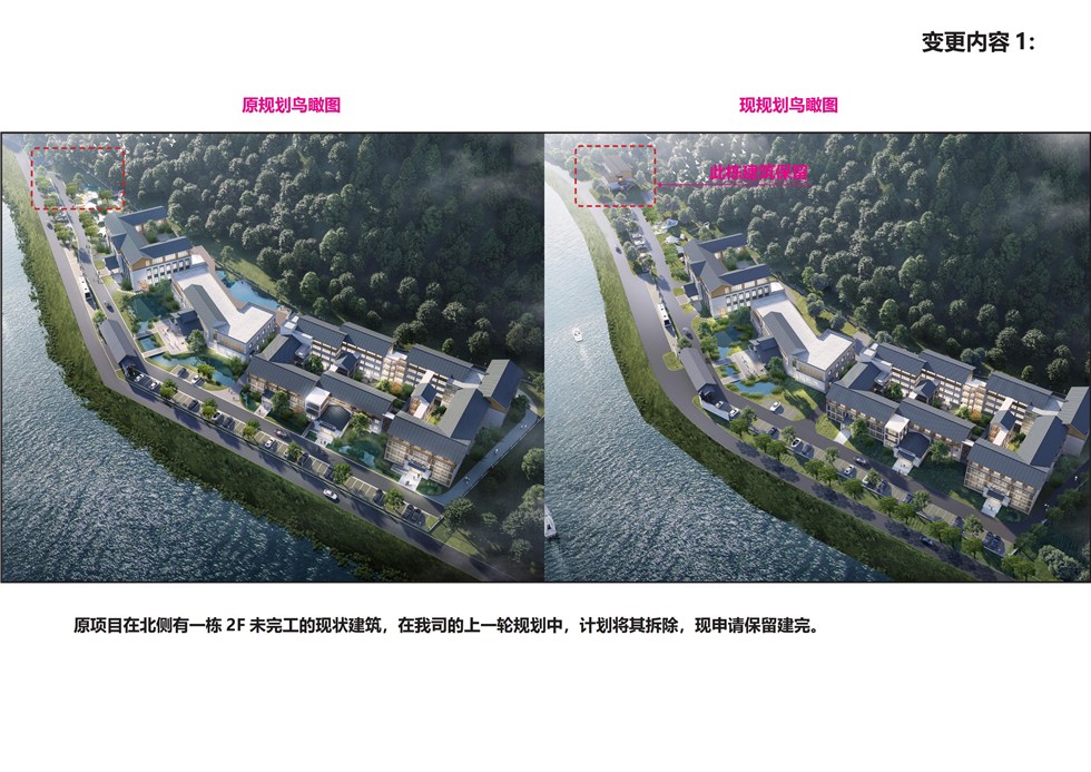 现规划方案申请变更,变更内容为:1、原项目在北侧有一栋 2F 未完工的现状建筑,计划将其拆除,现申请保留建完;2、集中式宾馆原平面布局顶层没有阳台,为了满足了客户需求的多样化,需要对三层和四层局部户型进行调整,外墙后退,形成开敞阳台;集中式宾馆原先设计的局部开放观景平台需要改为封闭观景平台;3、集中式宾馆、接待中心、餐饮会议中心底部增加毛石墙裙;4、大门的效果图局部变化;5、室外泳池、水系及风雨连廊、石板路变化。