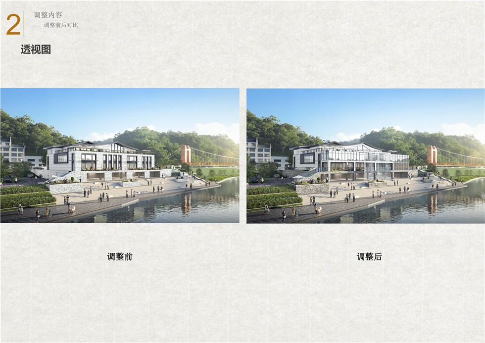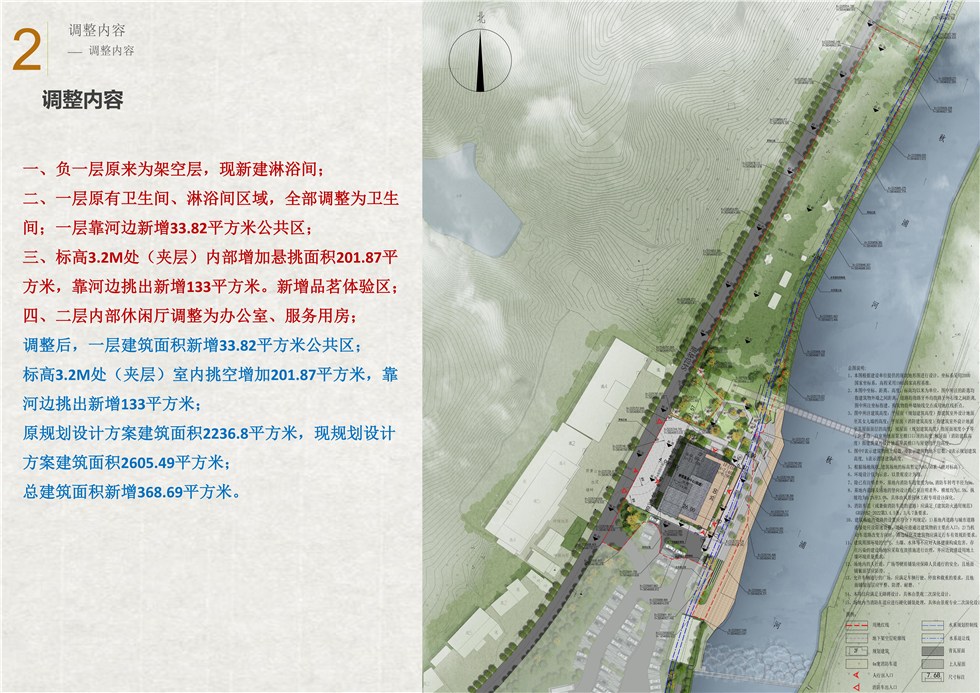 现申请对设计方案作出调整:1、负一层原来为架空层,现新建淋浴间;2、一层原有卫生间、淋浴间区域,全部调整为卫生间;一层靠河边新增33.82平方米公共区;3、标高3.2M处(夹层)内部增加悬挑面积201.87平方米,靠河边挑出新增133平方米。新增品茗体验区;4、二层内部休闲厅调整为办公室、服务用房;调整后,一层建筑面积新增33.82平方米公共区;标高3.2M处(夹层)室内挑空增加201.87平方米,靠河边挑出新增133平方米;总建筑面积新增368.69平方米。原规划设计方案建筑面积2236.8平方米,现规划设计方案建筑面积2605.49平方米。