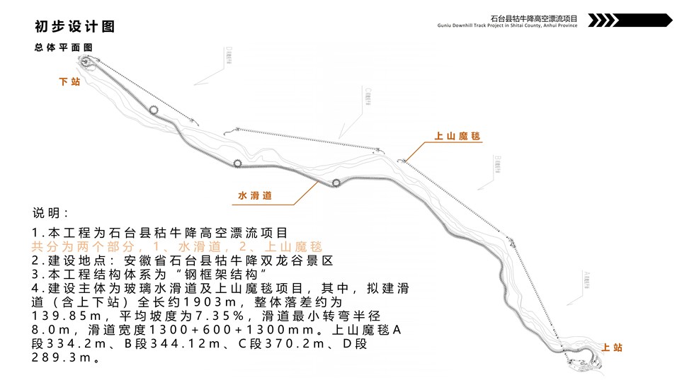 建设主体为玻璃水滑道及上山魔毯项目,其中拟建滑道(含上下站)全长约1903m,整体落差约为139.85m,平均坡度为7.35%,滑道最小转弯半径8.0m,滑道宽度为:1300+600+1300mm。,上山魔毯A段334.2m、B段344.12m、C段370.2m、D段289.3 m。