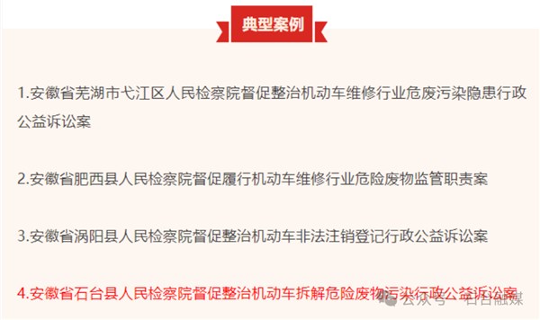 9月18日,安徽省人民检察院发布《公益诉讼检察专刊·机动车维修拆解领域》,此次入选案例共四件,其中石台县人民检察院办理的“督促整治机动车拆解危险废物污染行政公益诉讼案”入选。