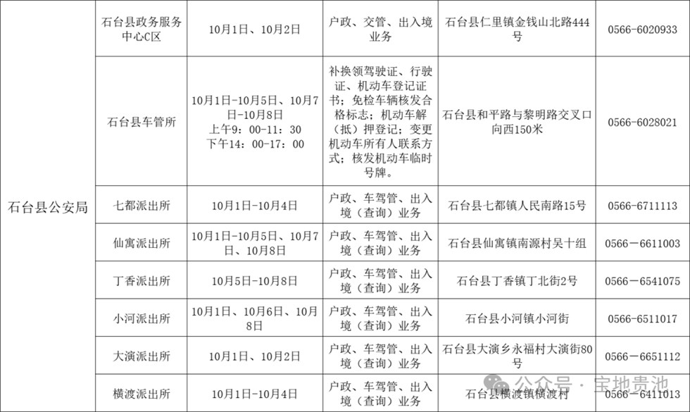2025年国庆中秋假期期间石台公安政务服务窗口开放情况一览表