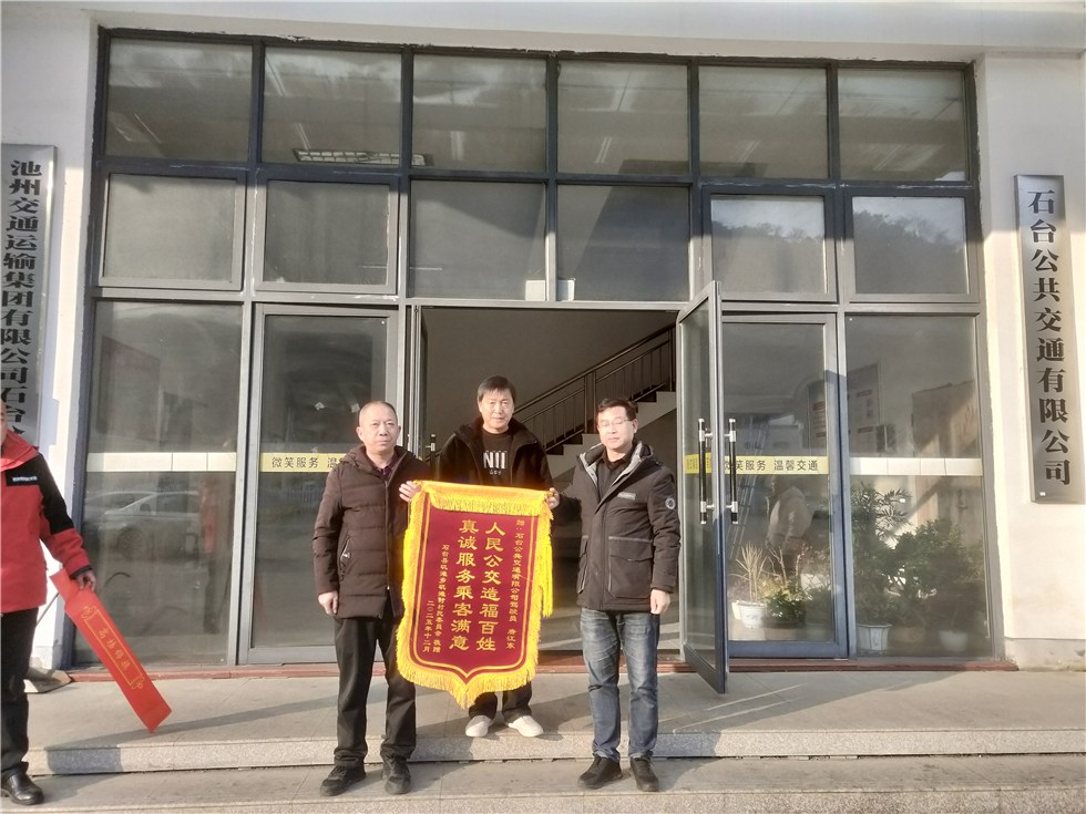 2025年12月11日上午,石台公共交通有限公司石台至矶滩公交线路的驾驶员们收获了一份满载敬意的特殊礼物。矶滩村党支部李书记带领村“两委”成员专程登门,将一面印着“人民公交造福百姓 真诚服务乘客满意”的锦旗送到驾驶员手中。锦旗虽轻,却承载着村民们最真挚的感谢,更凝聚着对驾驶员团队长期以来热情服务、敬业奉献精神的高度认可。