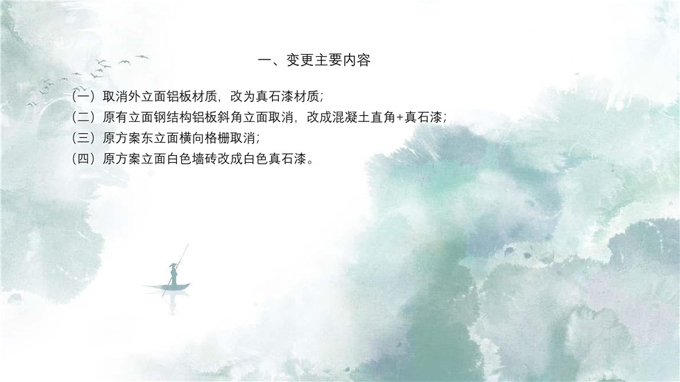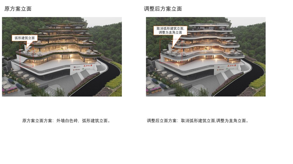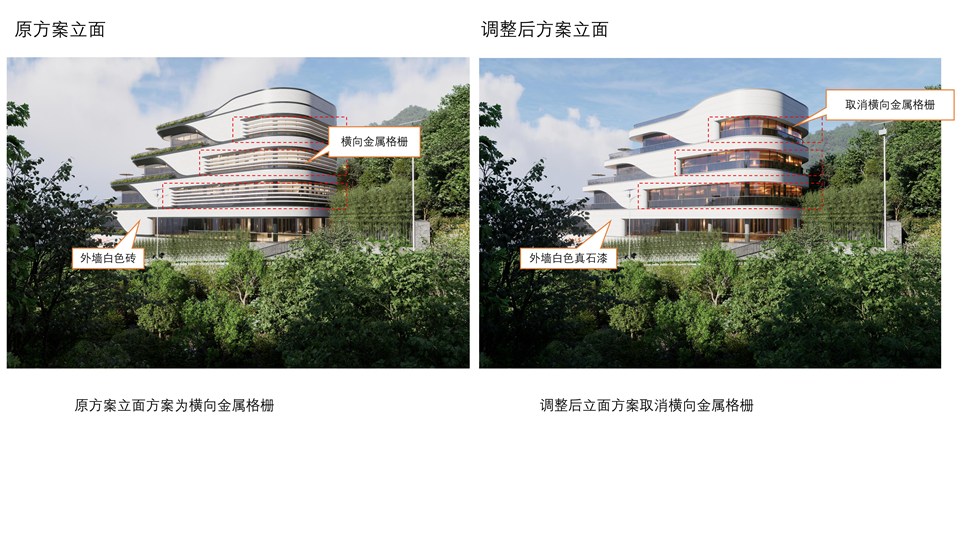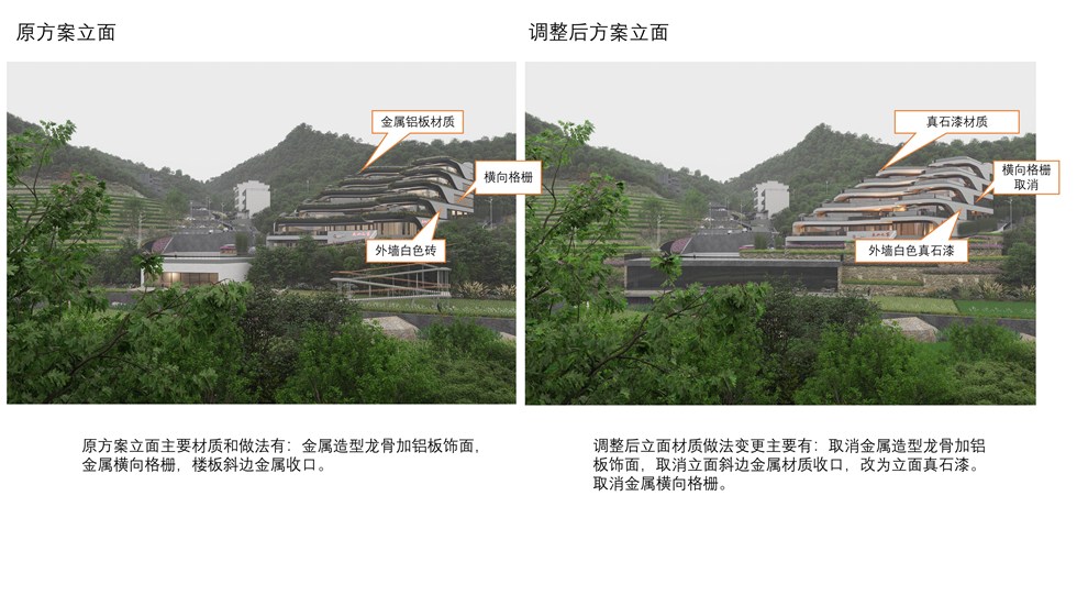 项目位于仙寓镇大山村,原规划设计方案业经2024年第7次县自然资源和规划委副主任会议审议通过,现申请变更。变更主要内容:1、取消外立面铝板材质,改为真石漆材质;2、原有立面钢结构铝板斜角立面取消,改成混凝土直角+真石漆;3、原方案东立面横向格栅取消;4、原方案立面白色墙砖改成白色真石漆。