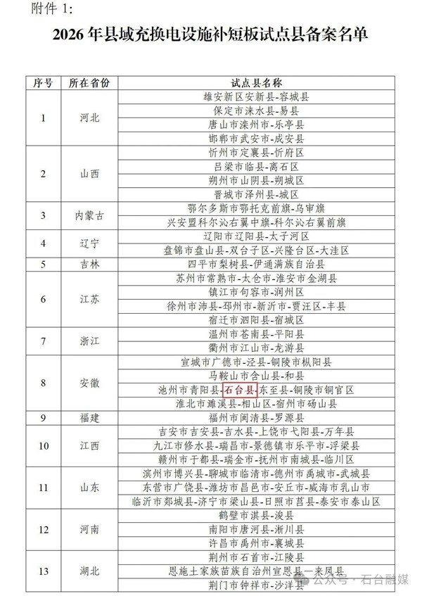 近日,财政部、工业和信息化部、交通运输部三部门联合发布公告,对2026年县域充换电设施补短板试点县备案审查及2024—2025年试点县备案调整结果进行公示,其中,石台县拟为2026年县域充换电设施补短板试点县。