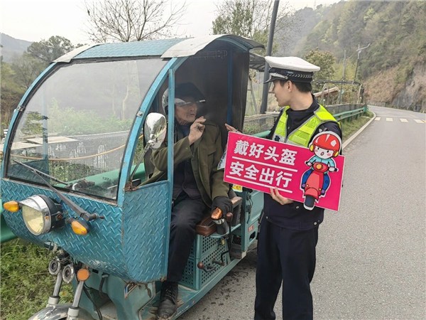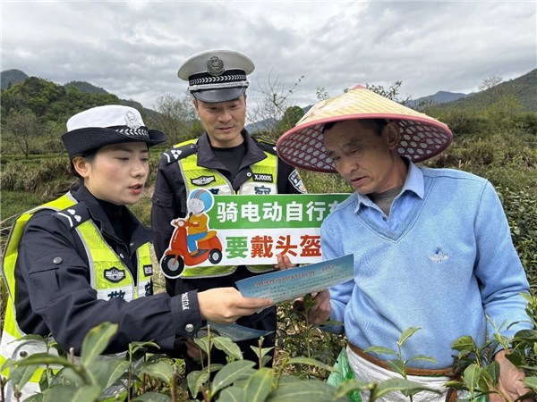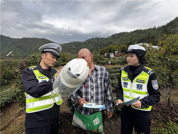 “大叔,三轮车可不能违规载人,多带一个人就多一份危险”。在茶园里,交警与大家唠家常、话安全,向茶农发放宣传手册,普及交通法律法规,详细讲解三轮车违法载人、疲劳驾驶、骑乘不戴头盔等交通违法行为的危害性,引导大家自觉遵守交通法规,养成良好出行习惯。