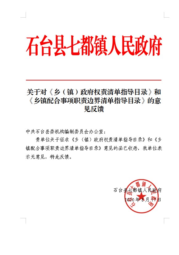 七都镇关于对《乡(镇)政府权责清单指导目录》和《乡镇配合事项职责边界清单指导目录》的意见反馈