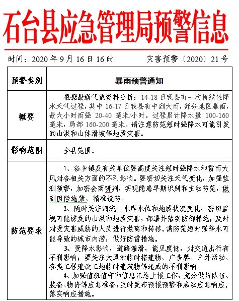 石台县应急管理局灾害预警〔2020〕21号