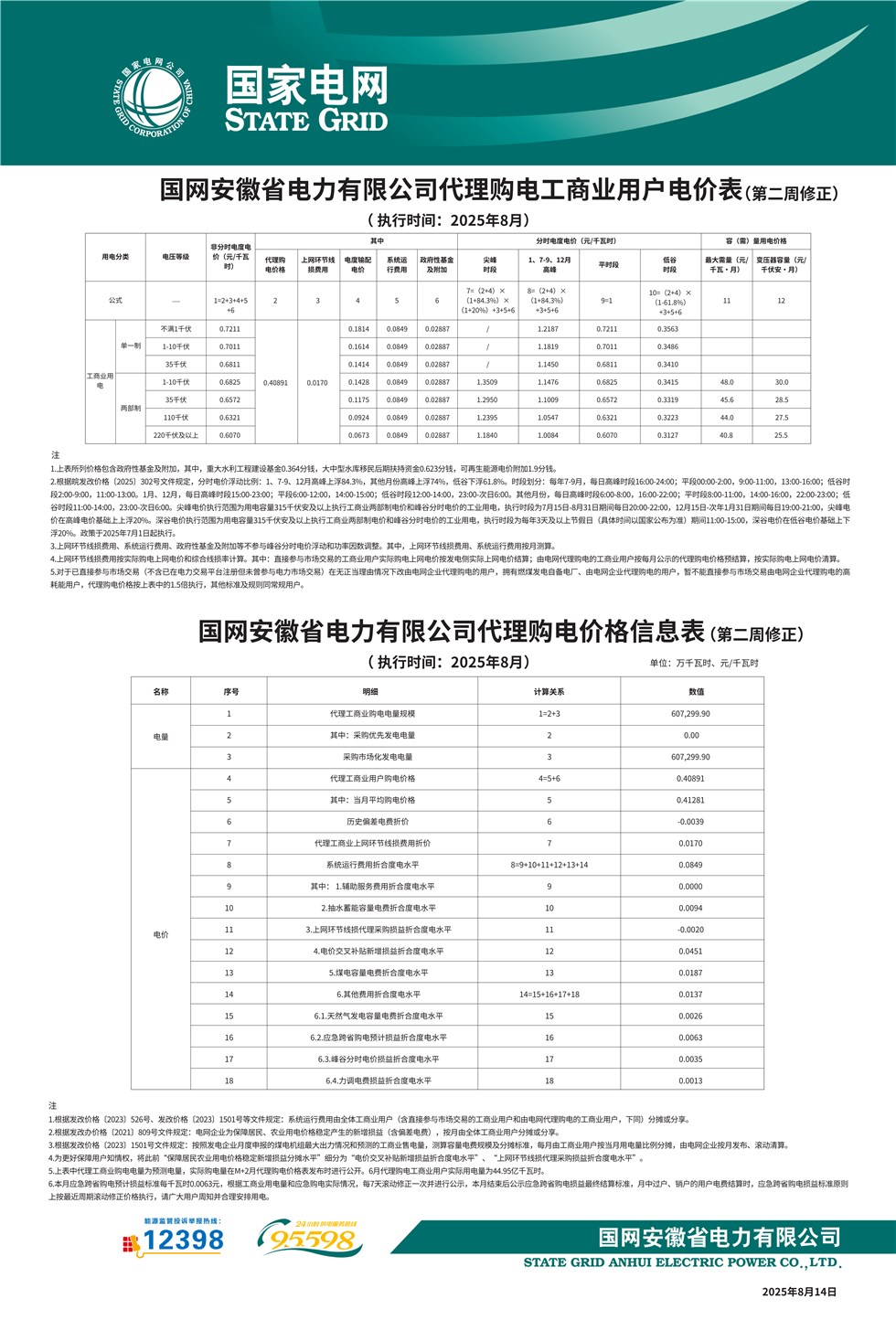 国网安徽省电力有限公司代理购电工商业用户电价表2025年8月(第二周修正)