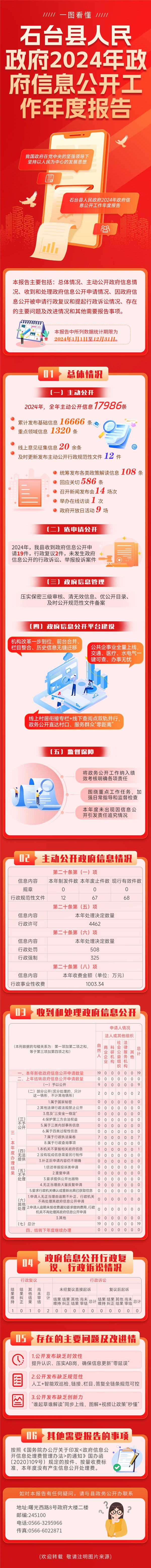 (一)主动公开。2024年,通过石台县人民政府门户网站主动公开各类政府信息共计17986条。切实保障规划计划、财政预决算、统计、人事等基础栏目信息公开及时有效,累计发布基础信息16666条;围绕基层政务公开标准化规范化目录,不断深化公共服务、就业创业、养老服务等重点领域信息公开,累计发布重点领域信息1320条。及时更新发布全县重大行政决策事项,主动公开行政规范性文件12件;推进行政决策过程透明化,公布面向公众的线上意见征集信息20余条。统筹发布各类政策解读信息108条,回应关切586条,召开新闻发布会14场次,举办在线访谈1次,政府开放日活动9场。